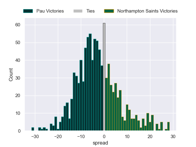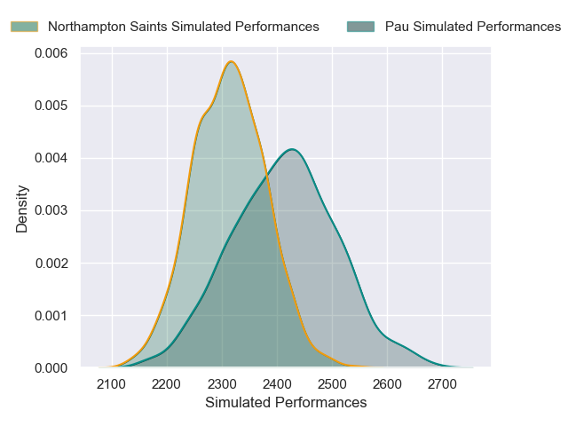 Each club has a rating and a rating deviation (similar to a Glicko rating), and expected performances can be generated. This allows for simulated matches and spreads like the ones below.