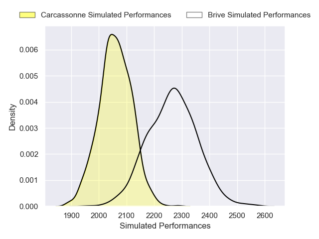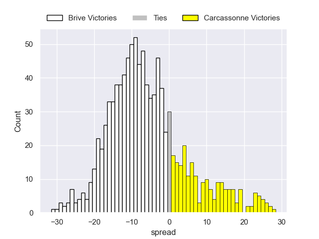 Each club has a rating and a rating deviation (similar to a Glicko rating), and expected performances can be generated. This allows for simulated matches and spreads like the ones below.
