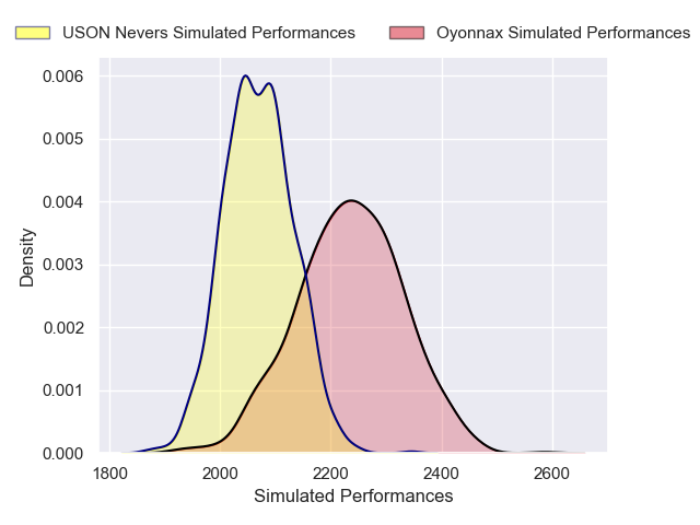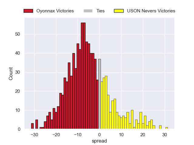 Each club has a rating and a rating deviation (similar to a Glicko rating), and expected performances can be generated. This allows for simulated matches and spreads like the ones below.