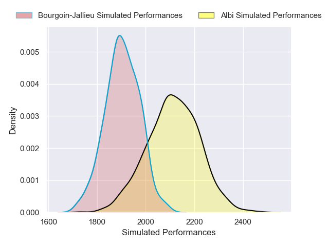 Each club has a rating and a rating deviation (similar to a Glicko rating), and expected performances can be generated. This allows for simulated matches and spreads like the ones below.