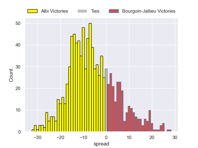 The first set of predictions treats a club as the smallest object, as the club develops its members, organizes a gameplan, and deploys its players as needed for each match. This club model is currently predicting Albi to win by 5.85.