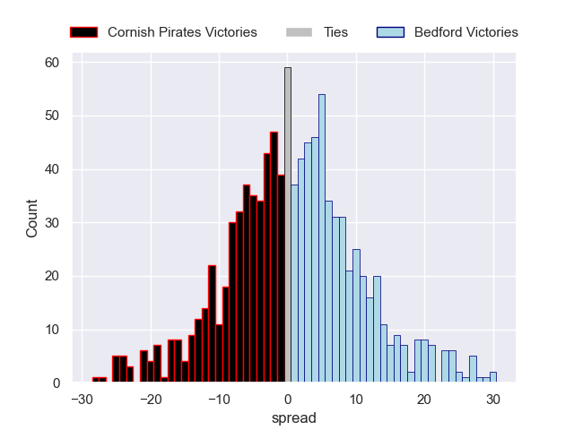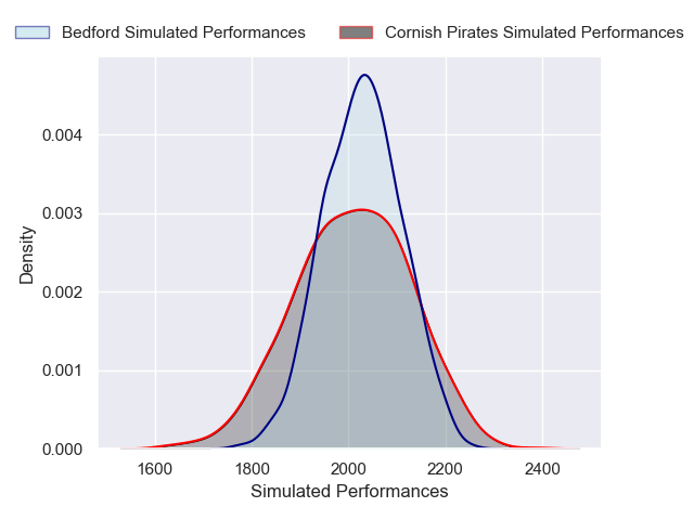 Each club has a rating and a rating deviation (similar to a Glicko rating), and expected performances can be generated. This allows for simulated matches and spreads like the ones below.