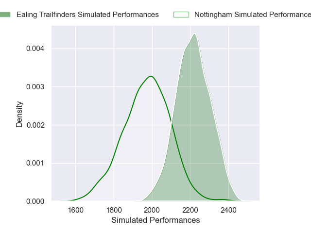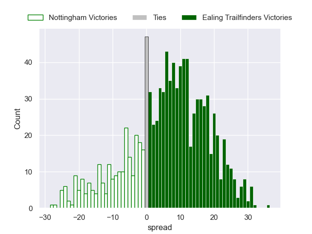 Each club has a rating and a rating deviation (similar to a Glicko rating), and expected performances can be generated. This allows for simulated matches and spreads like the ones below.