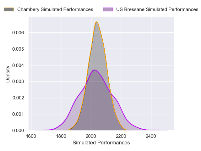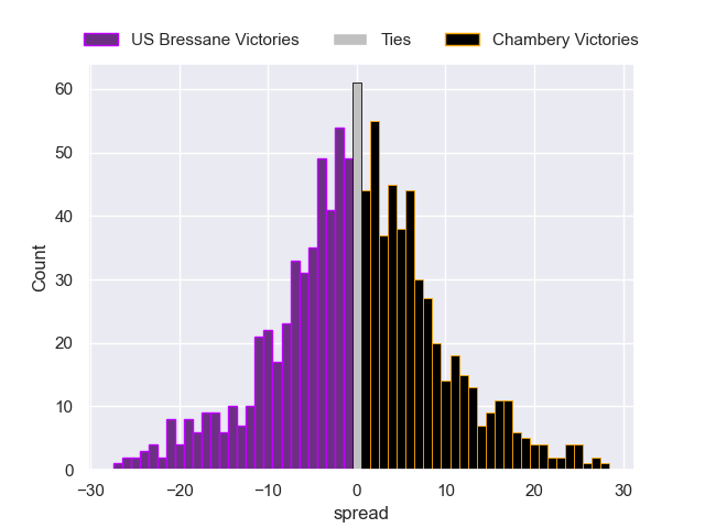 Each club has a rating and a rating deviation (similar to a Glicko rating), and expected performances can be generated. This allows for simulated matches and spreads like the ones below.