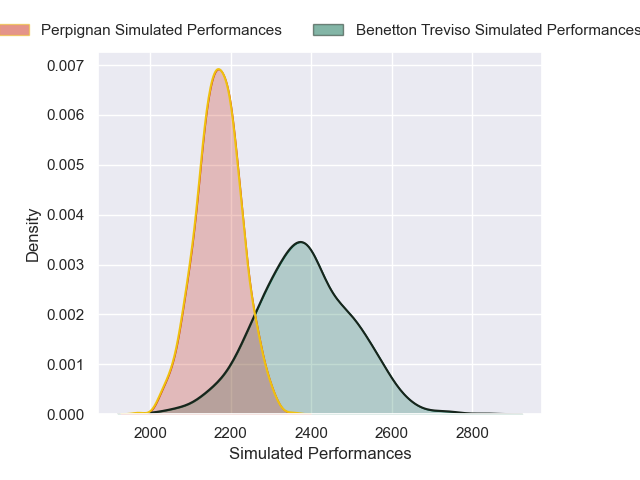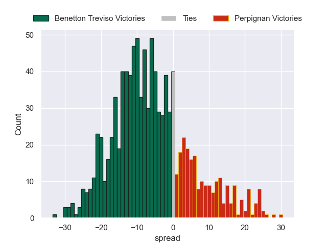 Each club has a rating and a rating deviation (similar to a Glicko rating), and expected performances can be generated. This allows for simulated matches and spreads like the ones below.
