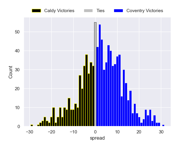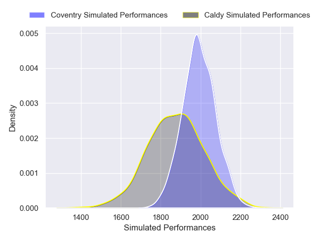 Each club has a rating and a rating deviation (similar to a Glicko rating), and expected performances can be generated. This allows for simulated matches and spreads like the ones below.