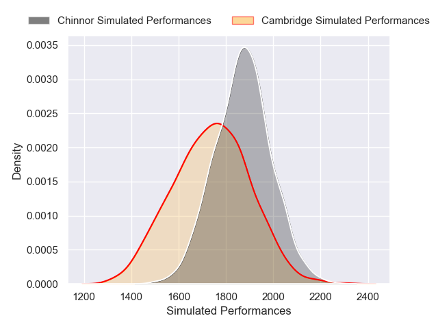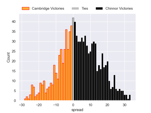 Each club has a rating and a rating deviation (similar to a Glicko rating), and expected performances can be generated. This allows for simulated matches and spreads like the ones below.