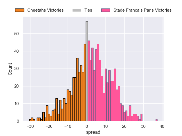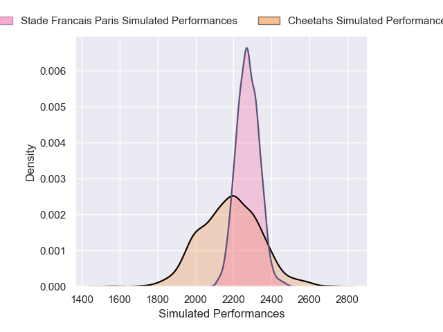 Each club has a rating and a rating deviation (similar to a Glicko rating), and expected performances can be generated. This allows for simulated matches and spreads like the ones below.