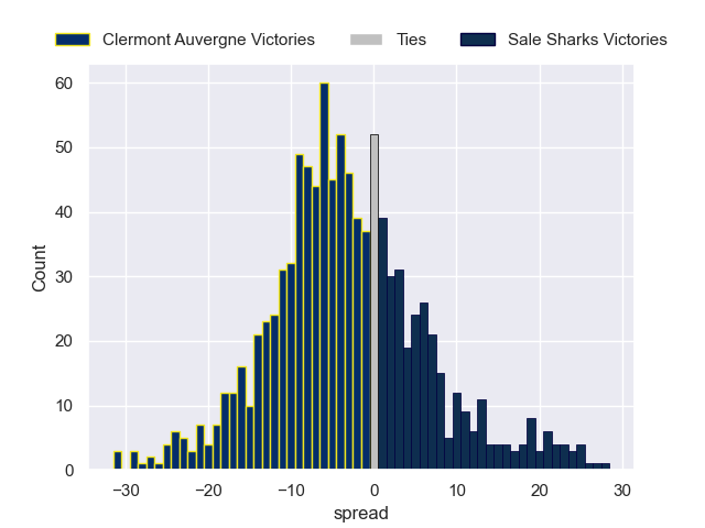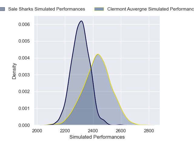 Each club has a rating and a rating deviation (similar to a Glicko rating), and expected performances can be generated. This allows for simulated matches and spreads like the ones below.