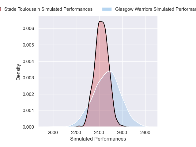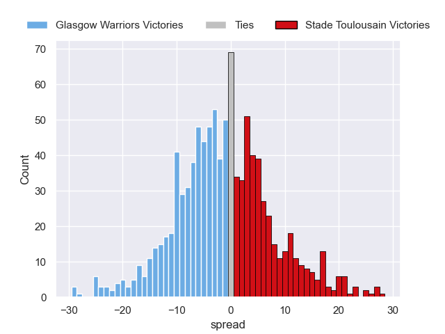 Each club has a rating and a rating deviation (similar to a Glicko rating), and expected performances can be generated. This allows for simulated matches and spreads like the ones below.