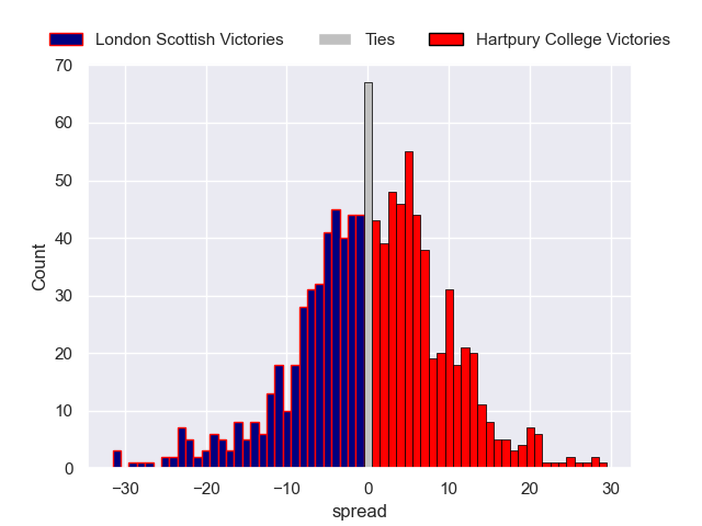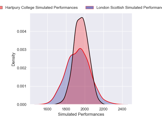 Each club has a rating and a rating deviation (similar to a Glicko rating), and expected performances can be generated. This allows for simulated matches and spreads like the ones below.