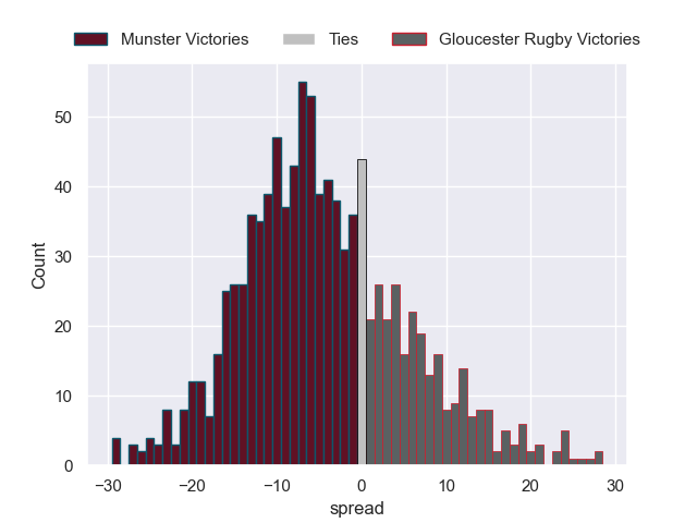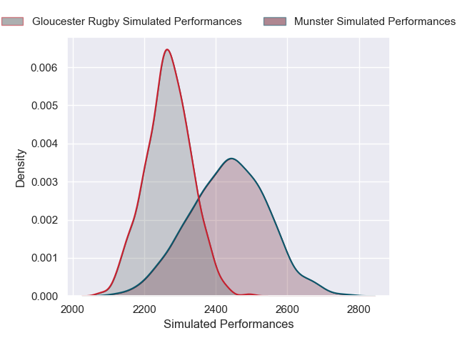 Each club has a rating and a rating deviation (similar to a Glicko rating), and expected performances can be generated. This allows for simulated matches and spreads like the ones below.