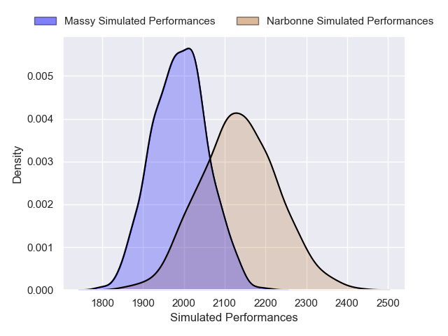 Each club has a rating and a rating deviation (similar to a Glicko rating), and expected performances can be generated. This allows for simulated matches and spreads like the ones below.