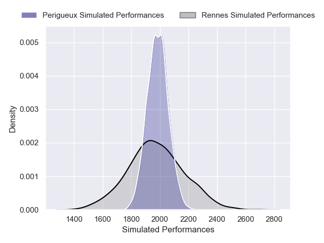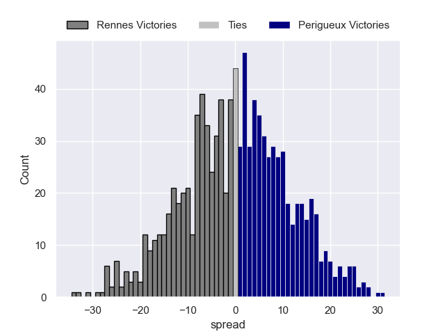 Each club has a rating and a rating deviation (similar to a Glicko rating), and expected performances can be generated. This allows for simulated matches and spreads like the ones below.