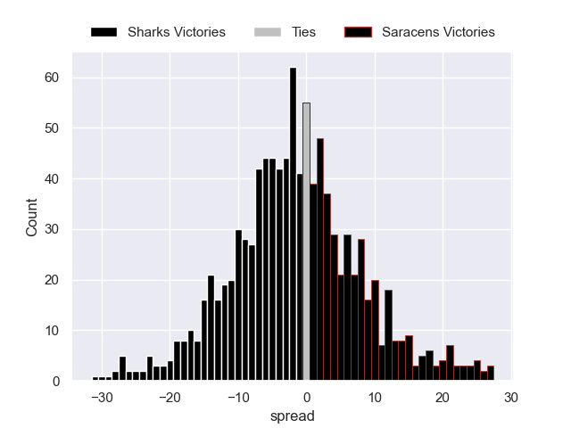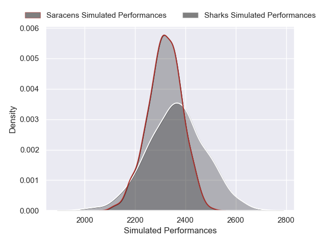 Each club has a rating and a rating deviation (similar to a Glicko rating), and expected performances can be generated. This allows for simulated matches and spreads like the ones below.