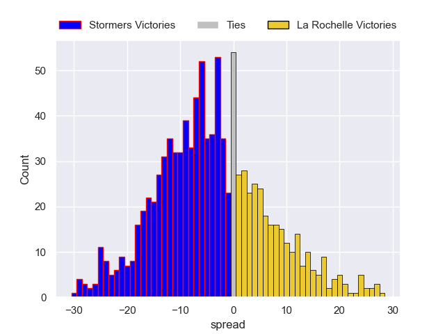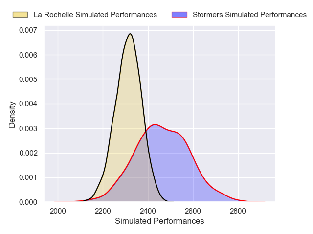 Each club has a rating and a rating deviation (similar to a Glicko rating), and expected performances can be generated. This allows for simulated matches and spreads like the ones below.