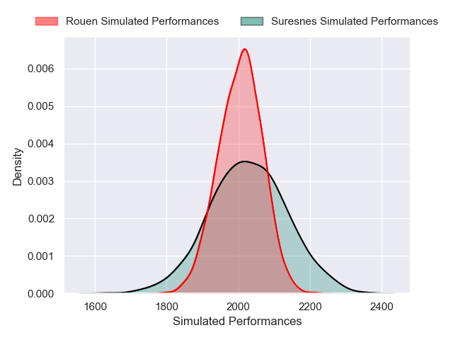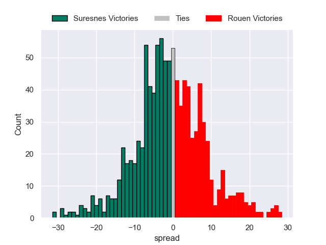 Each club has a rating and a rating deviation (similar to a Glicko rating), and expected performances can be generated. This allows for simulated matches and spreads like the ones below.