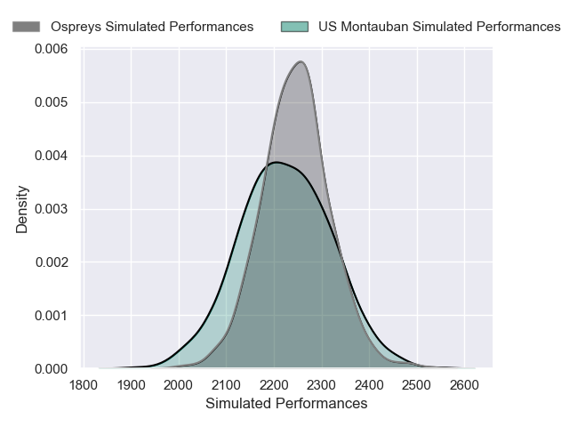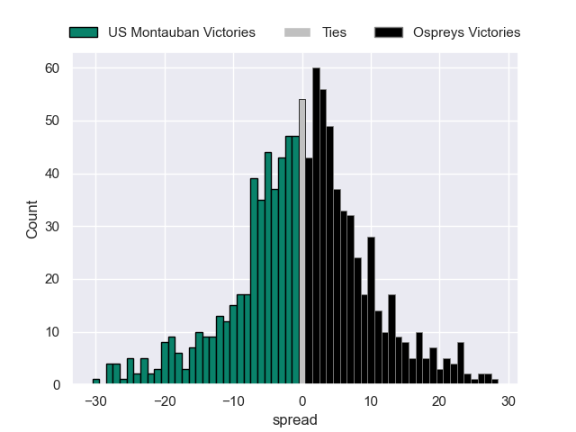 Each club has a rating and a rating deviation (similar to a Glicko rating), and expected performances can be generated. This allows for simulated matches and spreads like the ones below.