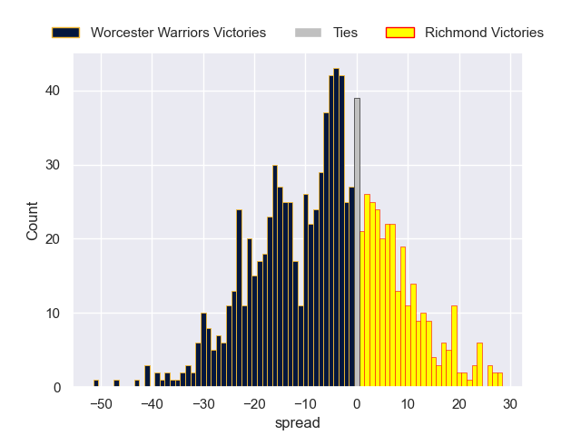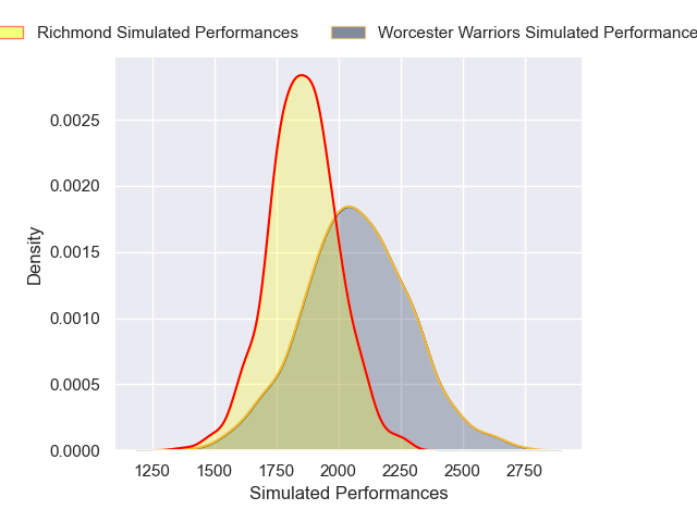 Each club has a rating and a rating deviation (similar to a Glicko rating), and expected performances can be generated. This allows for simulated matches and spreads like the ones below.