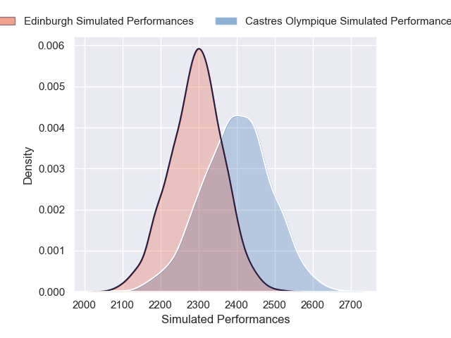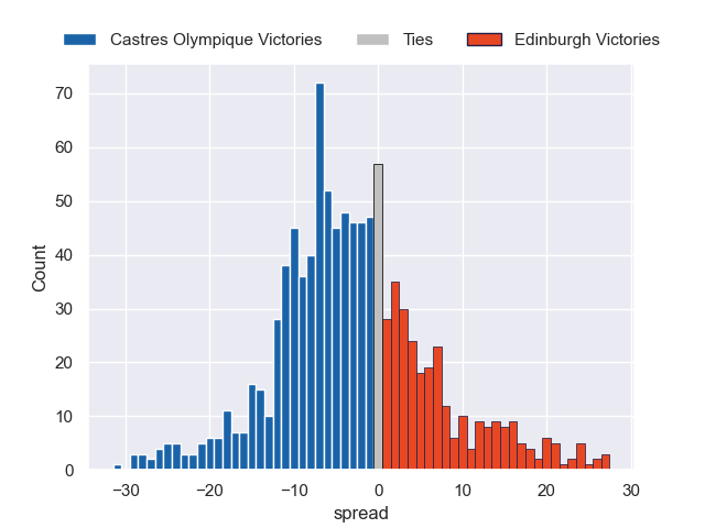 Each club has a rating and a rating deviation (similar to a Glicko rating), and expected performances can be generated. This allows for simulated matches and spreads like the ones below.