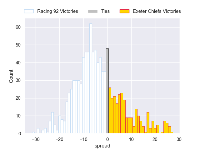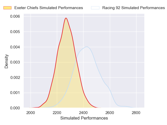 Each club has a rating and a rating deviation (similar to a Glicko rating), and expected performances can be generated. This allows for simulated matches and spreads like the ones below.