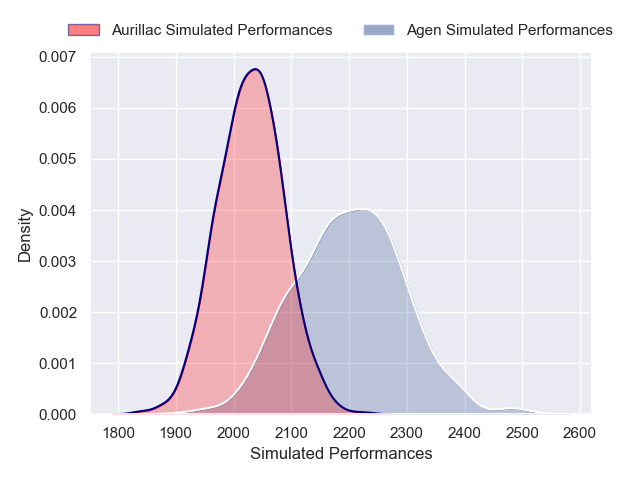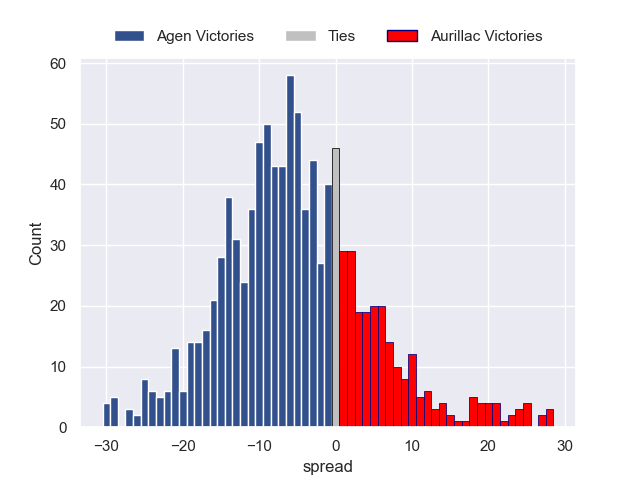 Each club has a rating and a rating deviation (similar to a Glicko rating), and expected performances can be generated. This allows for simulated matches and spreads like the ones below.