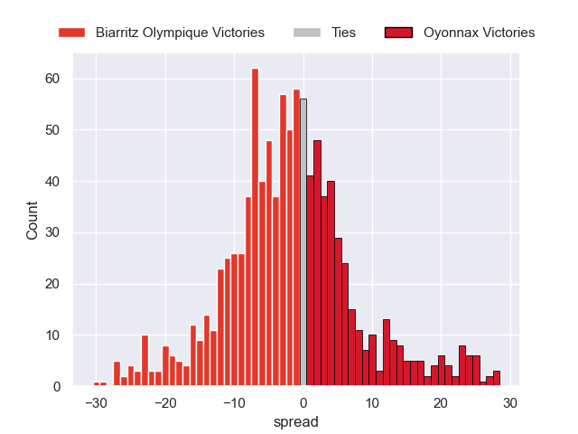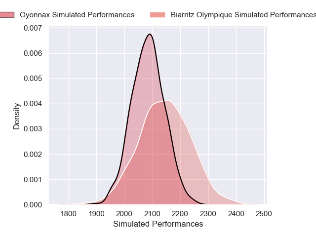 Each club has a rating and a rating deviation (similar to a Glicko rating), and expected performances can be generated. This allows for simulated matches and spreads like the ones below.
