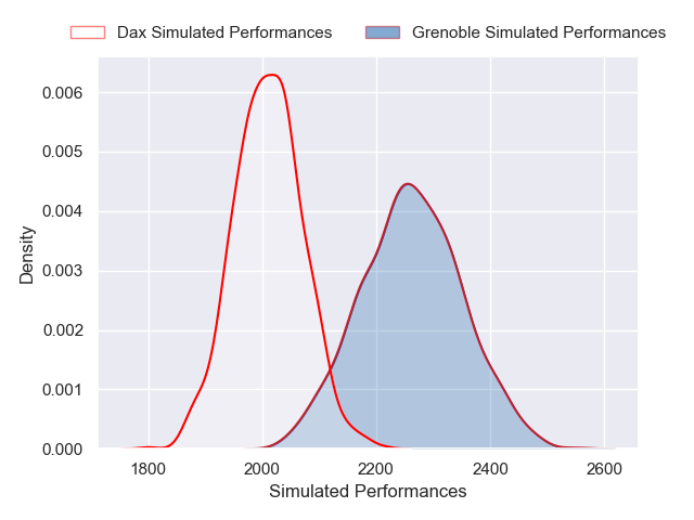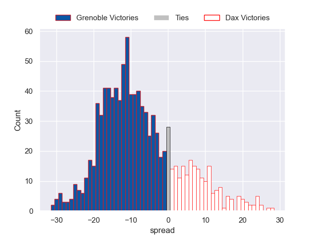 Each club has a rating and a rating deviation (similar to a Glicko rating), and expected performances can be generated. This allows for simulated matches and spreads like the ones below.