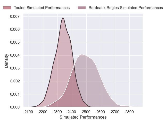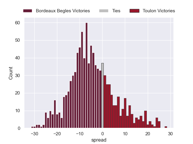 Each club has a rating and a rating deviation (similar to a Glicko rating), and expected performances can be generated. This allows for simulated matches and spreads like the ones below.
