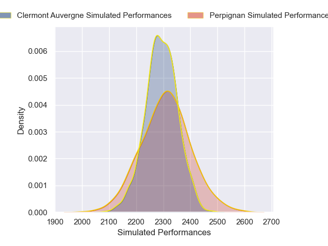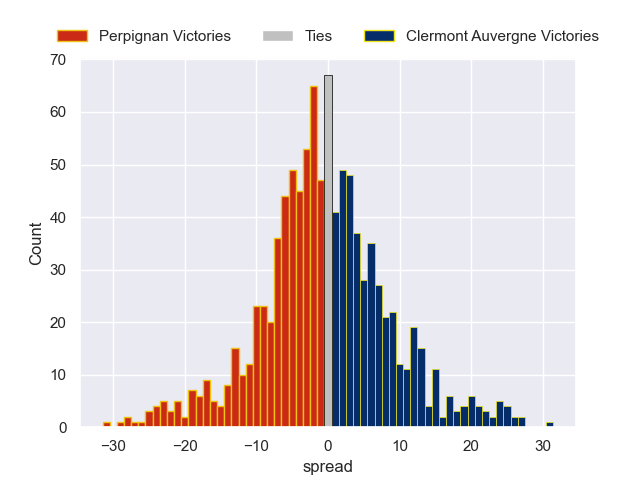 Each club has a rating and a rating deviation (similar to a Glicko rating), and expected performances can be generated. This allows for simulated matches and spreads like the ones below.