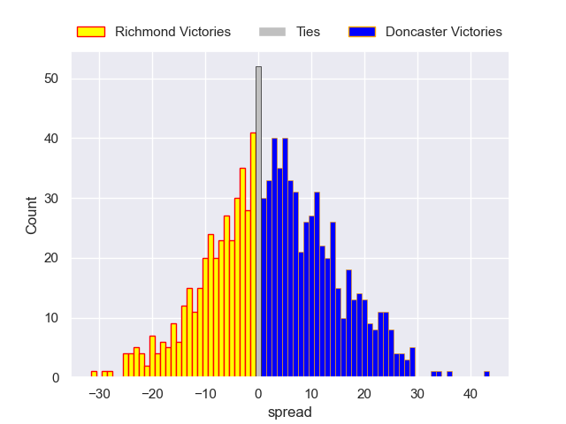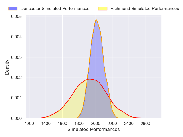 Each club has a rating and a rating deviation (similar to a Glicko rating), and expected performances can be generated. This allows for simulated matches and spreads like the ones below.