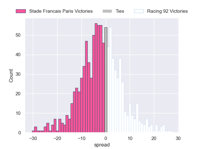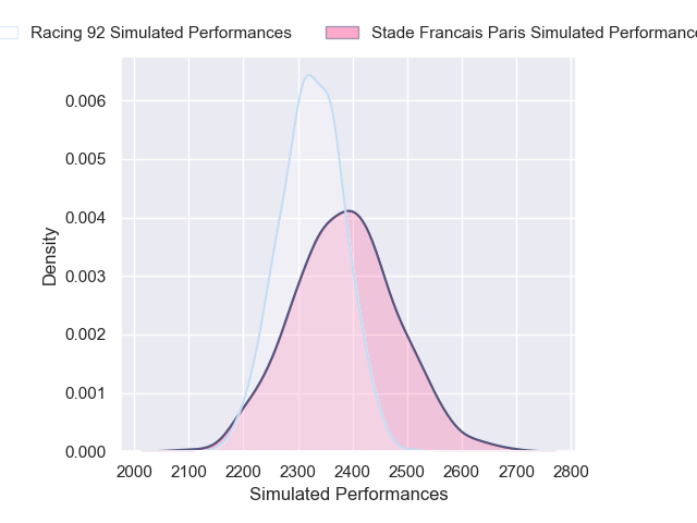 Each club has a rating and a rating deviation (similar to a Glicko rating), and expected performances can be generated. This allows for simulated matches and spreads like the ones below.