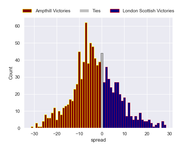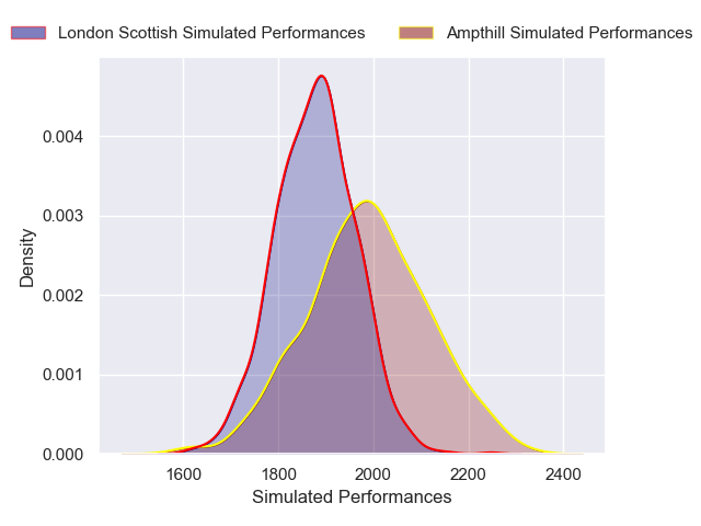 Each club has a rating and a rating deviation (similar to a Glicko rating), and expected performances can be generated. This allows for simulated matches and spreads like the ones below.