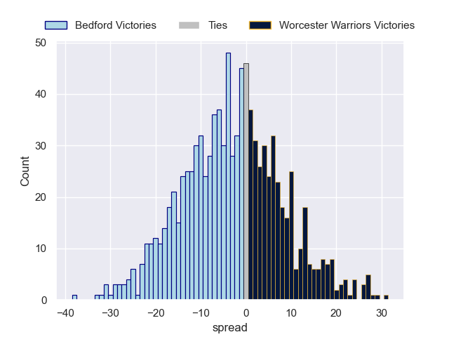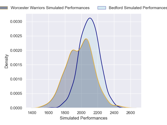 Each club has a rating and a rating deviation (similar to a Glicko rating), and expected performances can be generated. This allows for simulated matches and spreads like the ones below.