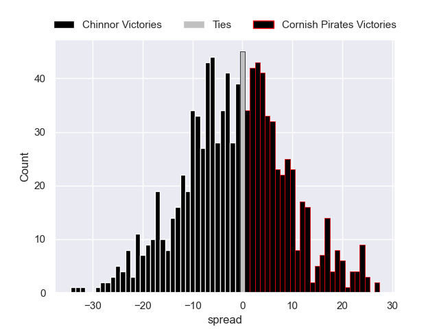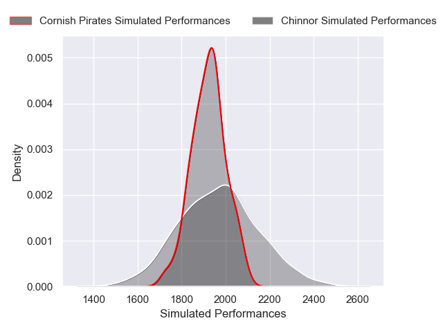 Each club has a rating and a rating deviation (similar to a Glicko rating), and expected performances can be generated. This allows for simulated matches and spreads like the ones below.