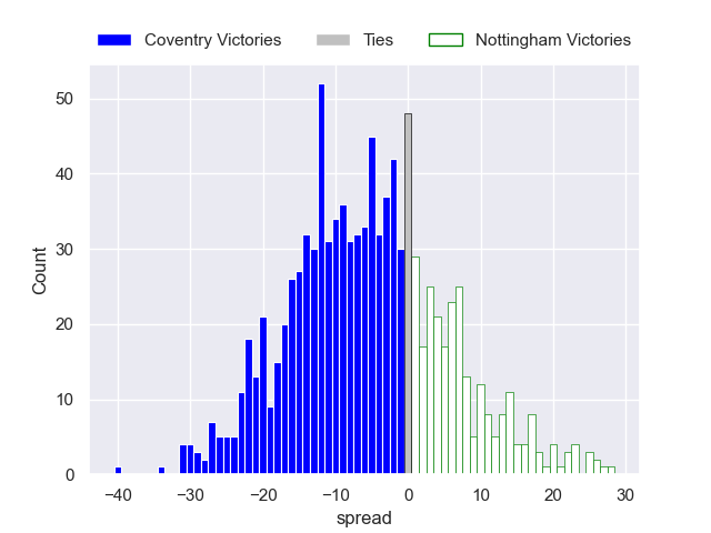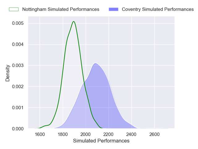Each club has a rating and a rating deviation (similar to a Glicko rating), and expected performances can be generated. This allows for simulated matches and spreads like the ones below.
