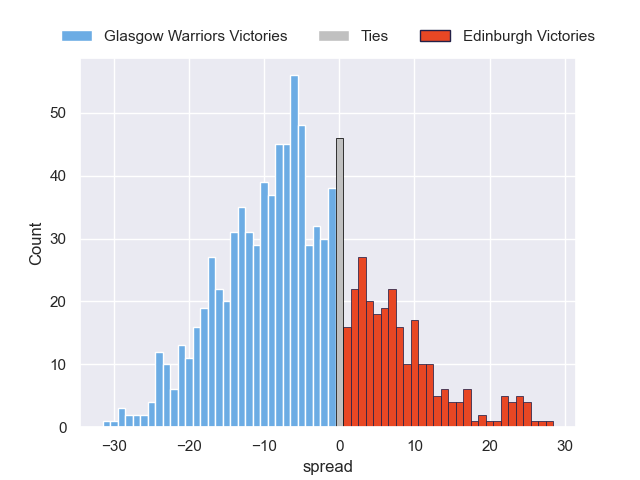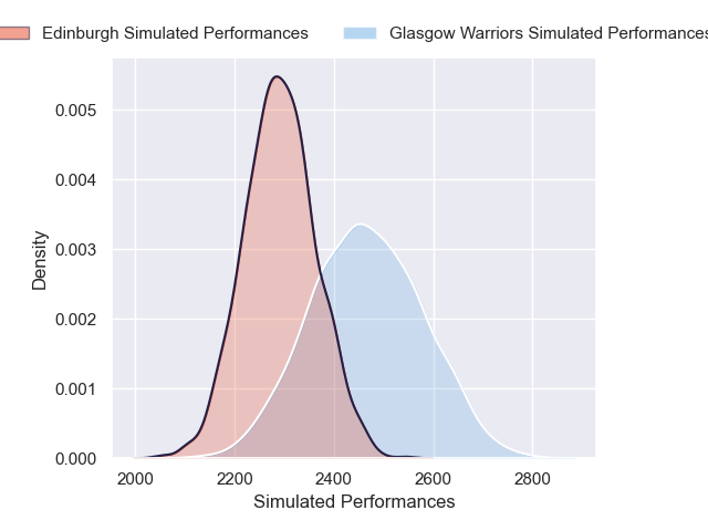 Each club has a rating and a rating deviation (similar to a Glicko rating), and expected performances can be generated. This allows for simulated matches and spreads like the ones below.