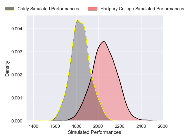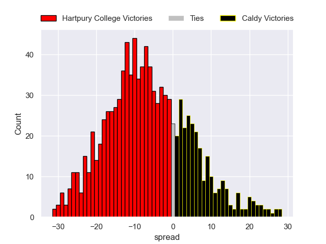 Each club has a rating and a rating deviation (similar to a Glicko rating), and expected performances can be generated. This allows for simulated matches and spreads like the ones below.