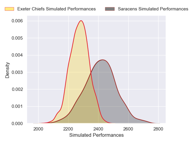 Each club has a rating and a rating deviation (similar to a Glicko rating), and expected performances can be generated. This allows for simulated matches and spreads like the ones below.