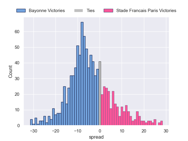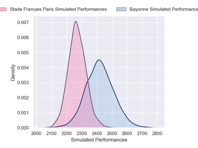 Each club has a rating and a rating deviation (similar to a Glicko rating), and expected performances can be generated. This allows for simulated matches and spreads like the ones below.