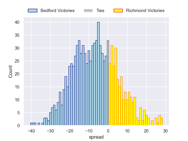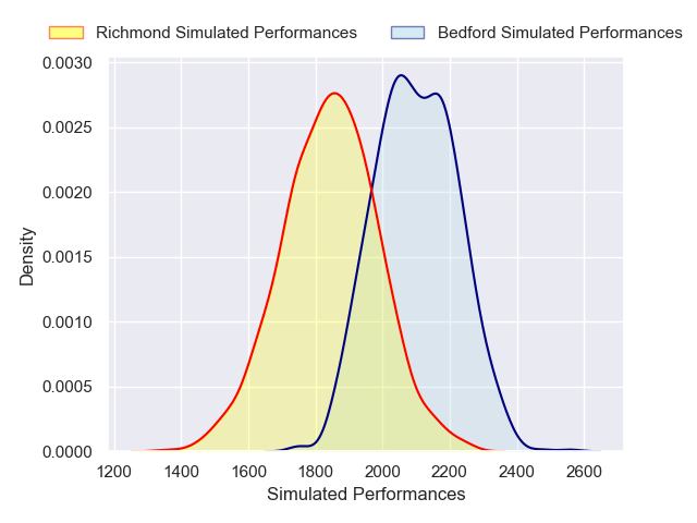 Each club has a rating and a rating deviation (similar to a Glicko rating), and expected performances can be generated. This allows for simulated matches and spreads like the ones below.