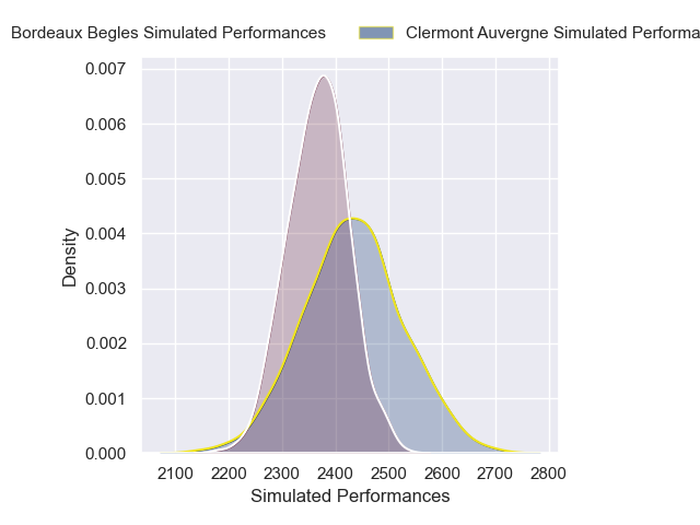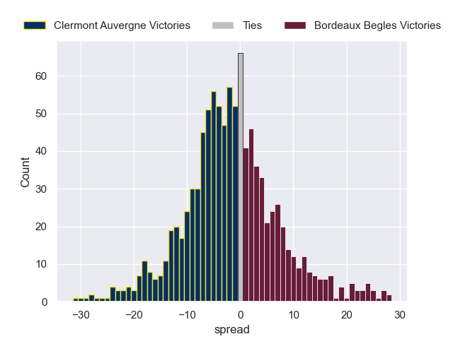 Each club has a rating and a rating deviation (similar to a Glicko rating), and expected performances can be generated. This allows for simulated matches and spreads like the ones below.