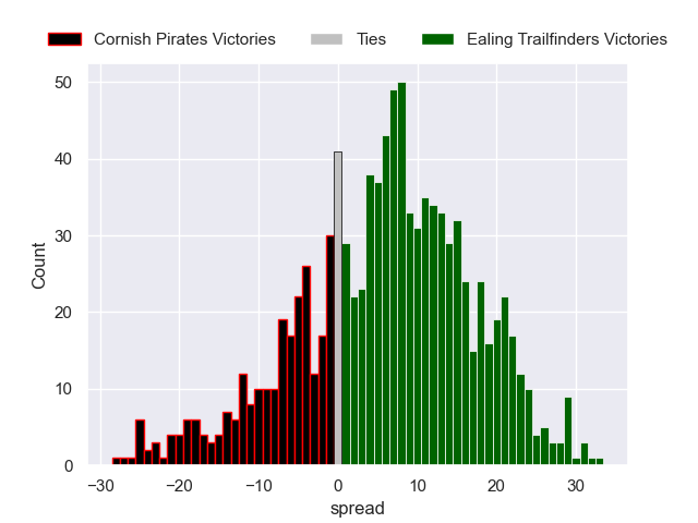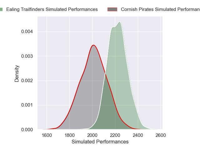 Each club has a rating and a rating deviation (similar to a Glicko rating), and expected performances can be generated. This allows for simulated matches and spreads like the ones below.