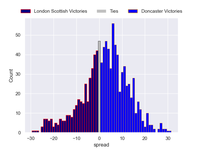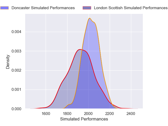 Each club has a rating and a rating deviation (similar to a Glicko rating), and expected performances can be generated. This allows for simulated matches and spreads like the ones below.