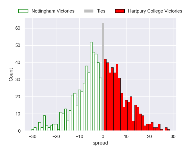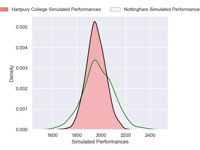 Each club has a rating and a rating deviation (similar to a Glicko rating), and expected performances can be generated. This allows for simulated matches and spreads like the ones below.