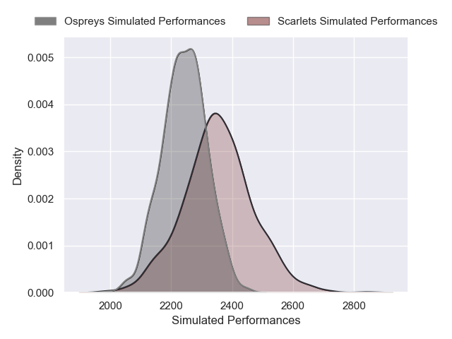 Each club has a rating and a rating deviation (similar to a Glicko rating), and expected performances can be generated. This allows for simulated matches and spreads like the ones below.
