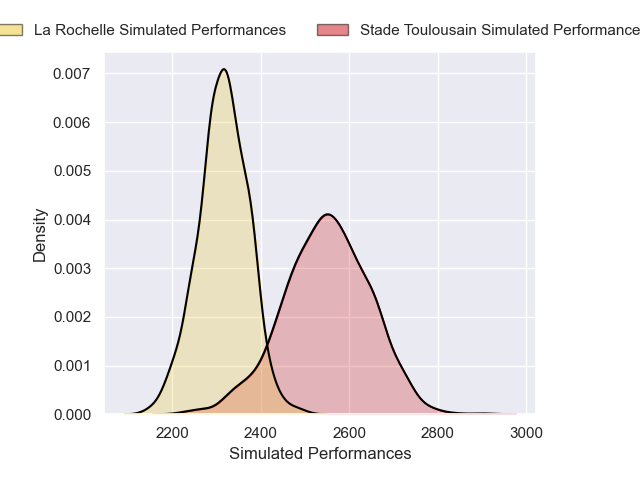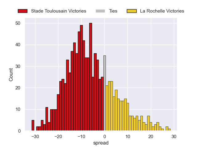 Each club has a rating and a rating deviation (similar to a Glicko rating), and expected performances can be generated. This allows for simulated matches and spreads like the ones below.
