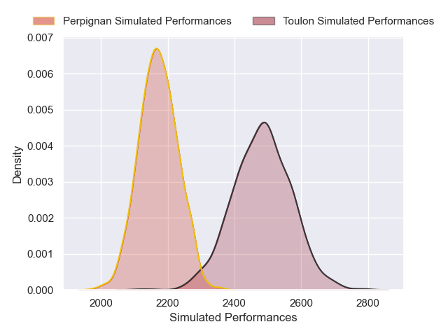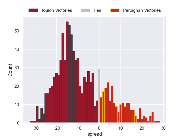 Each club has a rating and a rating deviation (similar to a Glicko rating), and expected performances can be generated. This allows for simulated matches and spreads like the ones below.
