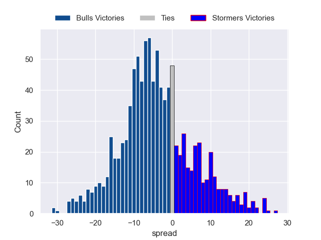 Each club has a rating and a rating deviation (similar to a Glicko rating), and expected performances can be generated. This allows for simulated matches and spreads like the ones below.