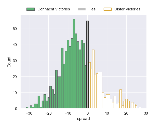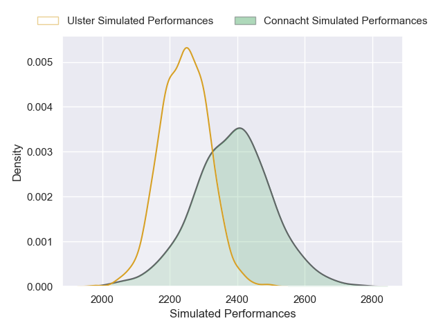 Each club has a rating and a rating deviation (similar to a Glicko rating), and expected performances can be generated. This allows for simulated matches and spreads like the ones below.